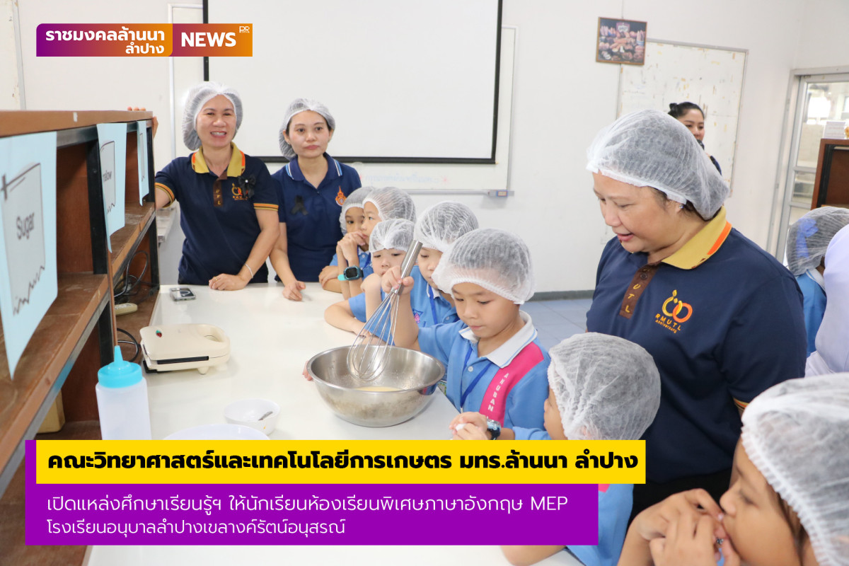 เมื่อวันที่ 14 พฤศจิกายน 2568 ผู้ช่วยศาสตราจารย์วรัญญา ธาราเวชรักษ์ รองคณบดีคณะวิทยาศาสตร์และเทคโนโลยีการเกษตร มหาวิทยาลัยเทคโนโลยีราชมงคลล้านนา ลำปาง (มทร.ล้านนา ลำปาง) พร้อมด้วยคณาจารย์และบุคลากร ร่วมให้การต้อนรับนักเรียน และคณะครู ชั้นประถมศึกษาปีที่ 1 ห้องเรียนพิเศษภาษาอังกฤษ MEP (Mini English Program) โรงเรียนอนุบาลลำปางเขลางค์รัตน์อนุสรณ์ ที่เข้าทำกิจกรรมศึกษาแหล่งเรียนรู้ English camp 2025 จำนวน 60 คน