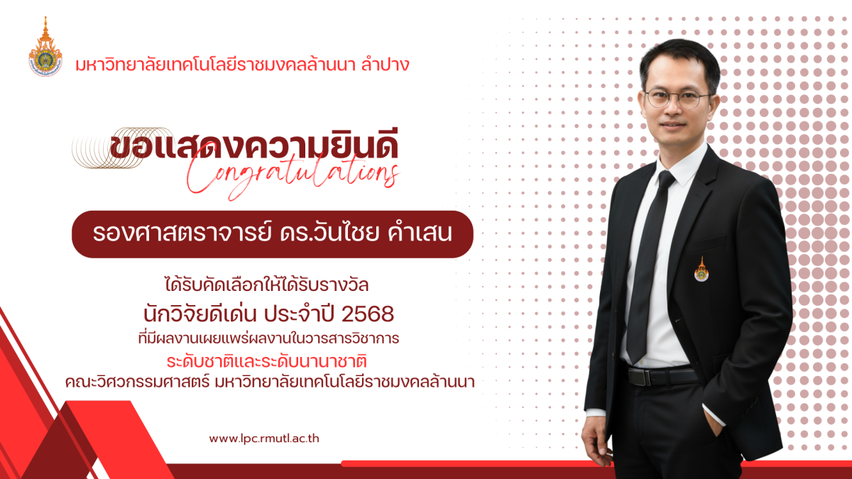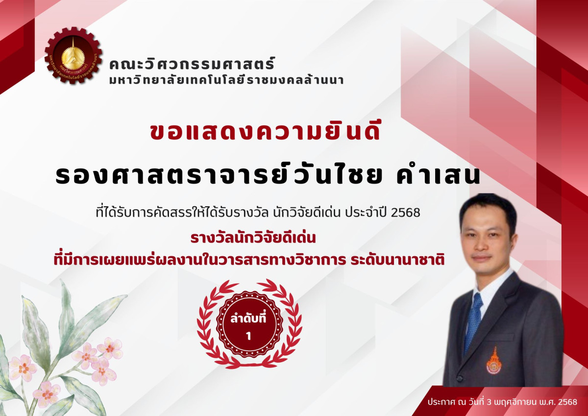 รองศาสตราจารย์ ดร.วันไชย คำเสน รองคณบดีคณะวิศวกรรมศาสตร์ มหาวิทยาลัยเทคโนโลยีราชมงคลล้านนา ลำปาง ได้รับคัดเลือกรับรางวัล “นักวิจัยดีเด่น คณะวิศวกรรมศาสตร์” ประจำปี 2568 ซึ่งจัดโดยคณะวิศวกรรมศาสตร์ มทร.ล้านนา เพื่อประกาศเกียรติคุณและเชิดชูนักวิจัยที่มีผลงานวิชาการโดดเด่น สร้างประโยชน์ต่อวงการวิชาการและต่อการพัฒนามหาวิทยาลัย