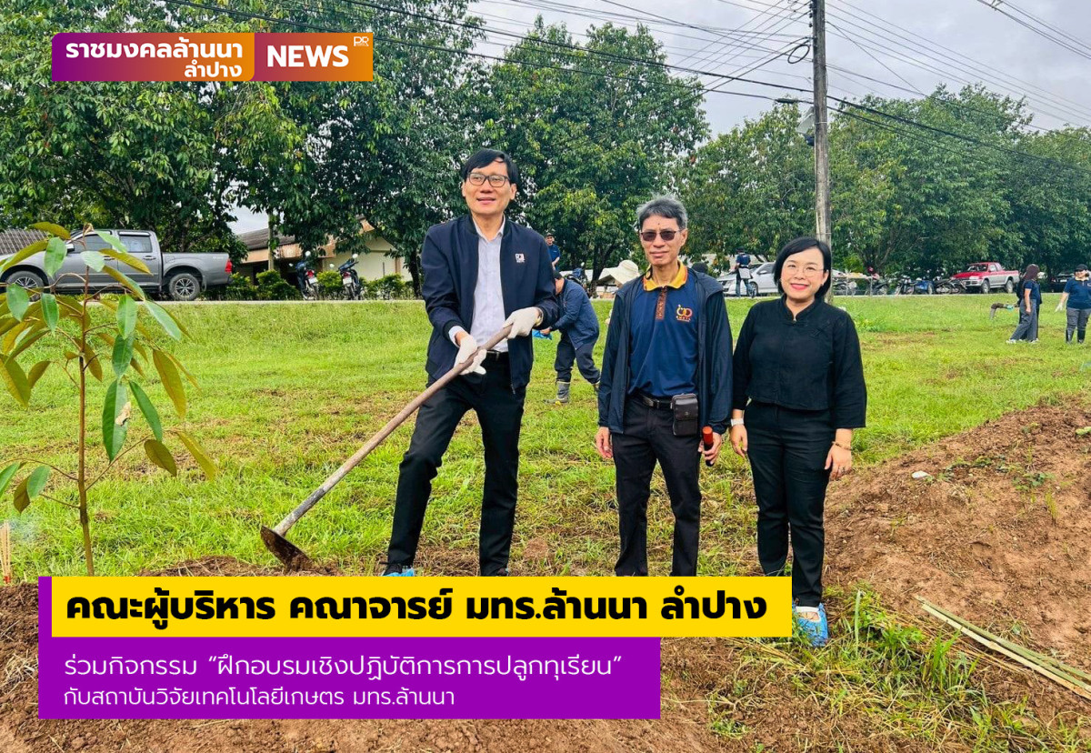 วานนี้ (18 พย.68) ผู้ช่วยศาสตราจารย์ไพโรจน์ ไชยเมืองชื่น ผู้อำนวยการสำนักงานบริหาร มหาวิทยาลัยเทคโนโลยีราชมงคลล้านนา ลำปาง (มทร.ล้านนา ลำปาง) และคณะผู้บริหาร คณาจารย์ ร่วมกิจกรรม "การฝึกอบรมเชิงปฏิบัติการการปลูกทุเรียน" ณ แปลงไม้ผล สถาบันวิจัยเทคโนโลยีเกษตร มทร.ล้านนา ซึ่งจัดโดยสถาบันวิจัยเทคโนโลยีเกษตร มทร.ล้านนา ภายใต้ โครงการศึกษาความเป็นไปได้การจัดการทรัพย์สินและสร้างรายได้