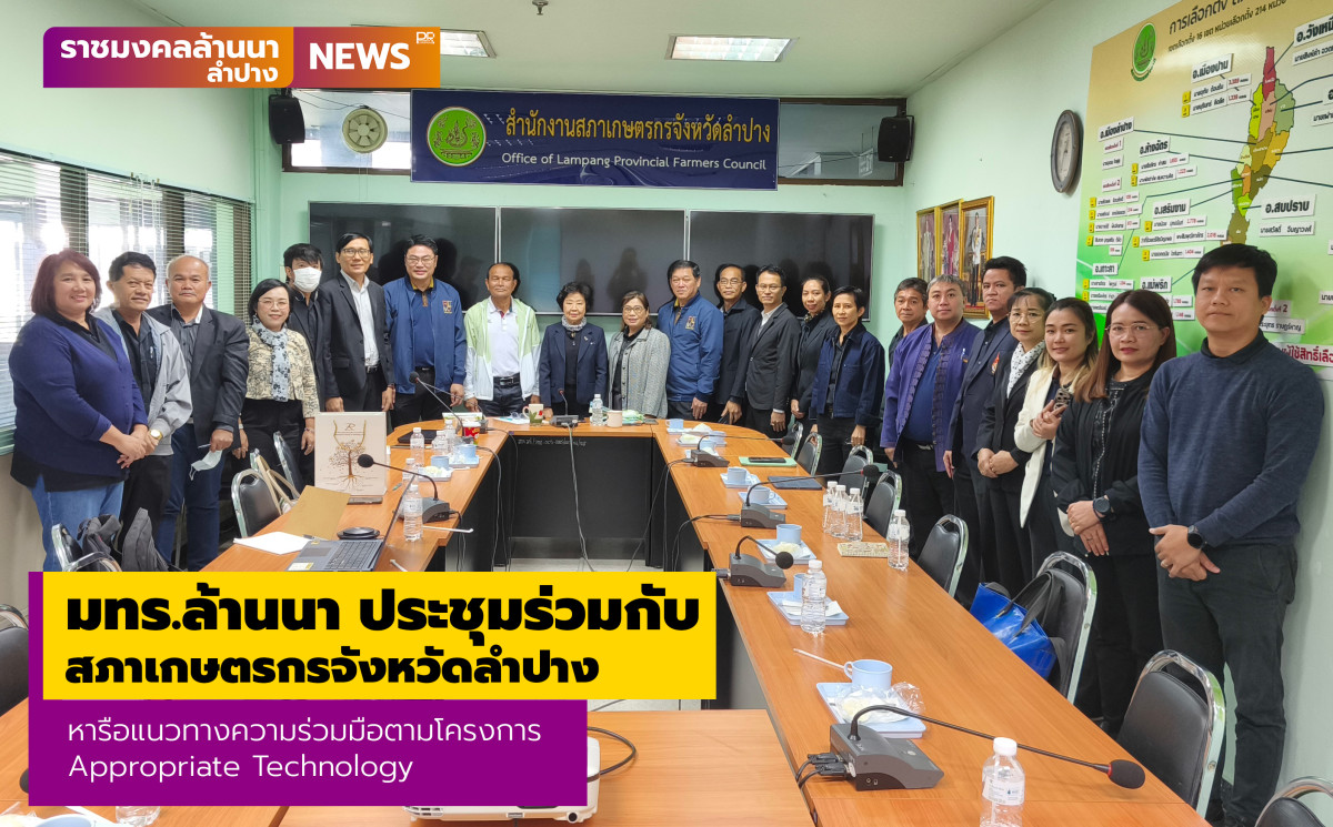 วันนี้ (27 พย.68) ที่ห้องประชุมสำนักงานสภาเกษตกรจังหวัดลำปาง คณะผู้บริหาร มหาวิทยาลัยเทคโนโลยีราชมงคลล้านนา (เชียงใหม่ และลำปาง) ร่วมประชุมแลกเปลี่ยนและหารือแนวทางความร่วมมือกับสภาเกษตรกรจังหวัดลำปาง ตามโครงการ Appropriate Technology มหาวิทยาลัยเทคโนโลยีราชมงคลล้านนา