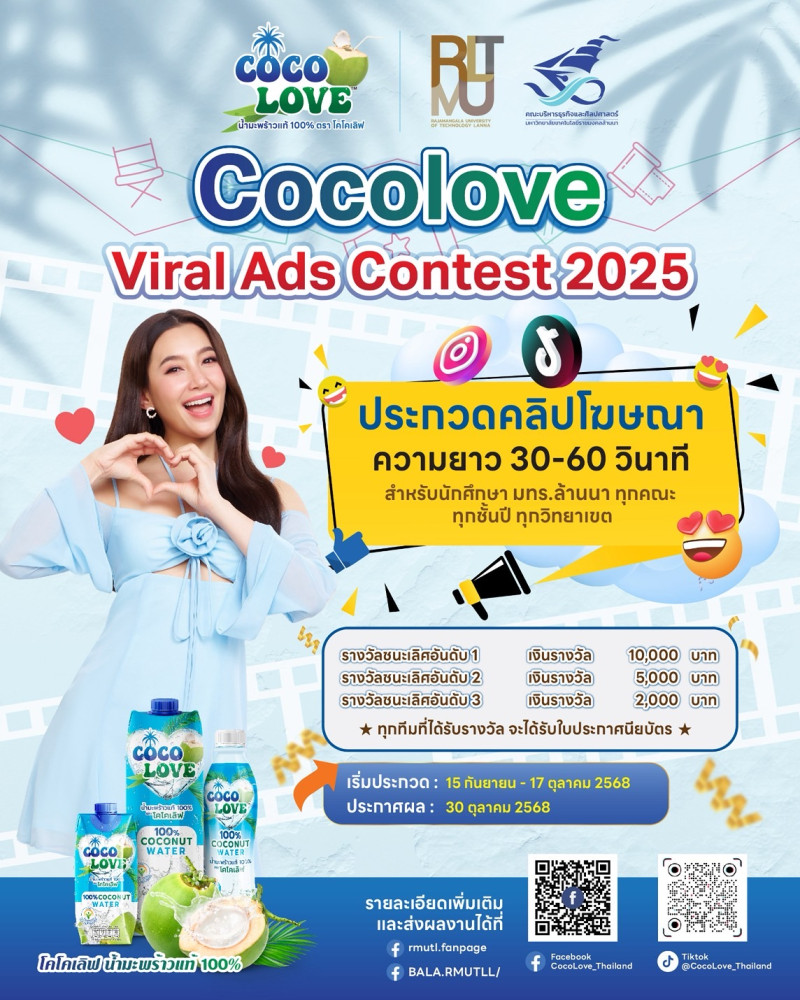 กิจกรรมดังกล่าวจัดโดยแบรนด์ “Cocolove (โคโคเลิฟ)” บริษัท ยูนิคอร์น คอนซูมเมอร์ กรุ๊ป จำกัด ร่วมกับ คณะบริหารธุรกิจและศิลปศาสตร์ มทร.ล้านนา เพื่อเปิดโอกาสให้นักศึกษาได้แสดงศักยภาพด้านการตลาดและความคิดสร้างสรรค์ส่งเสริมการดื่มน้ำผลไม้เพื่อสุขภาพ โดยจัดประกวดคลิปสื่อโฆษณาผ่านแพลตฟอร์ม Tiktok ความยาว 30-60 วินาที ประกวด 2 ประเภท ประกอบด้วย ประเภทความคิดสร้างสรรค์ ประเด็นของคุณประโยชน์ของน้ำมะพร้าว COCO Love และประเภทเนื้อหาสาระ ในประเด็นการดื่มน้ำมะพร้าว COCO Love ตาม Lifestyle ในชีวิตประจำวัน โดยมีการประกาศผลเมื่อเดือนตุลาคม 2568 ที่ผ่านมา และรับรางวัลเร็วๆนี้ ทั้งนี้สมาชิกในทีมประกอบด้วย นางสาวเมวดี พึ่งพา นางสาวกัญญณัฐ แตงทอง นางสาวนิชดา กระต่ายจันทร์ นางสาวปรียากร เรียนเก่ง และนายกิตติพิชญ์ บุญเทียม ทั้งนี้มีอาจารย์อนิตา ประดาอินทร์ เป็นอาจารย์ที่ปรึกษา