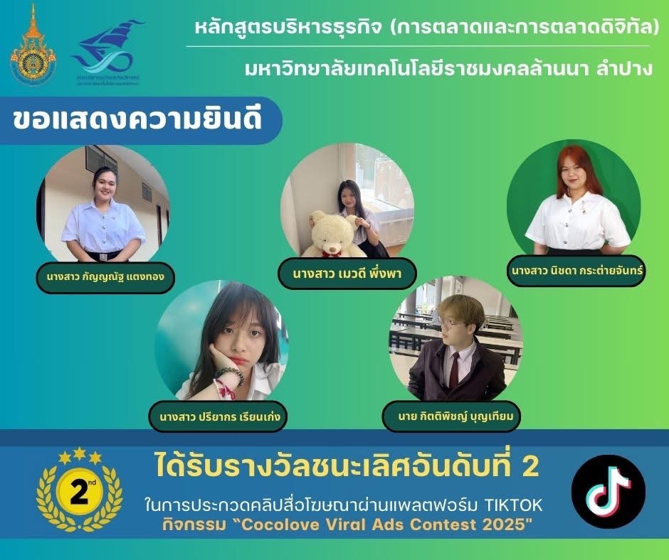 นักศึกษาหลักสูตรบริหารธุรกิจ (การตลาดและการตลาดดิจิทัล) คณะบริหารธุรกิจและศิลปศาสตร์ มหาวิทยาลัยเทคโนโลยีราชมงคลล้านนา ลำปาง (มทร.ล้านนา ลำปาง) รับรางวัลรองชนะเลิศ การประกวดคลิปสื่อโฆษณาผ่านแพลตฟอร์ม Tiktok ในกิจกรรม “Cocolove Viral Ads Contest 2025” ประเภท การดื่มน้ำมะพร้าว COCO Love ตาม Lifestyle ในชีวิตประจำวัน (เนื้อหาสาระ)