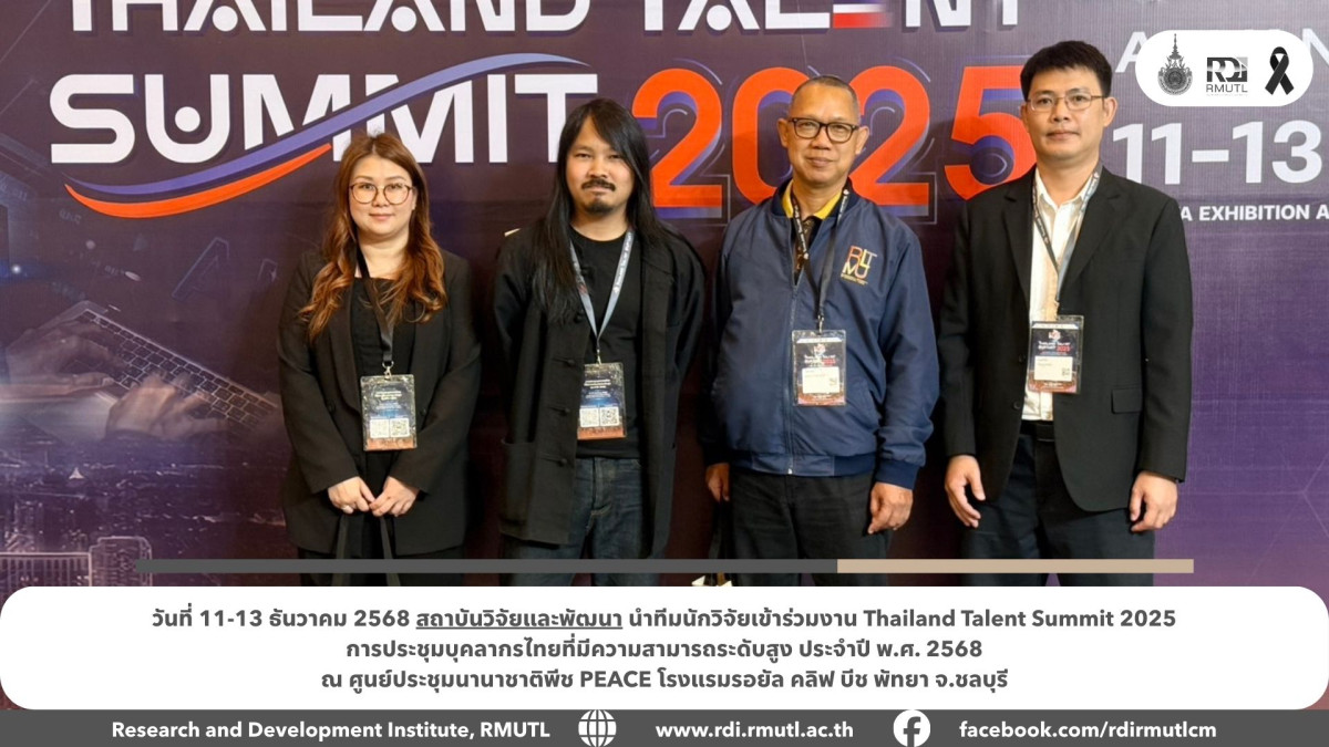 สถาบันวิจัยและพัฒนา นำทีมนักวิจัย มหาวิทยาลัยเทคโนโลยีราชมงคลล้านนา เข้าร่วมงาน Thailand Talent Summit 2025 ระหว่างวันที่ 11–13 ธันวาคม 2568 ณ ศูนย์ประชุมนานาชาติพัทยา (PEACH) จังหวัดชลบุรี งานครั้งนี้จัดขึ้นเพื่อขับเคลื่อนศักยภาพบุคลากรวิจัยไทยสู่ระดับชาติและนานาชาติ ภายใต้แนวคิด “Fostering Thailand Future: Advancing Innovation and National Impact" นำโดย ดร.รัตนพล พนมวัน ณ อยุธยา รองผู้อำนวยการสถาบันวิจัยและพัฒนา นำทีมนักวิจัยที่ได้รับทุน SF และบุคลากรเข้าร่วมงาน ได้แก่ นางสาวณิชกมล โพธิ์แก้ว เจ้าหน้าที่วิจัย สวพ. มทร.ล้านนา, ผู้ช่วยศาสตราจารย์ ดร.มนต์ชัย ปัญญาทอง อาจารย์คณะวิศวกรรมศาสตร์ มทร.ล้านนา เชียงราย นำเสนอผลงานแบบบรรยาย Oral Presentation และนายธนวิชญ์ นิลวรรณ บัณฑิตศึกษา คณะศิลปกรรมและสถาปัตยกรรมศาสตร์ นำเสนอผลงานแบบ Poster Presentation