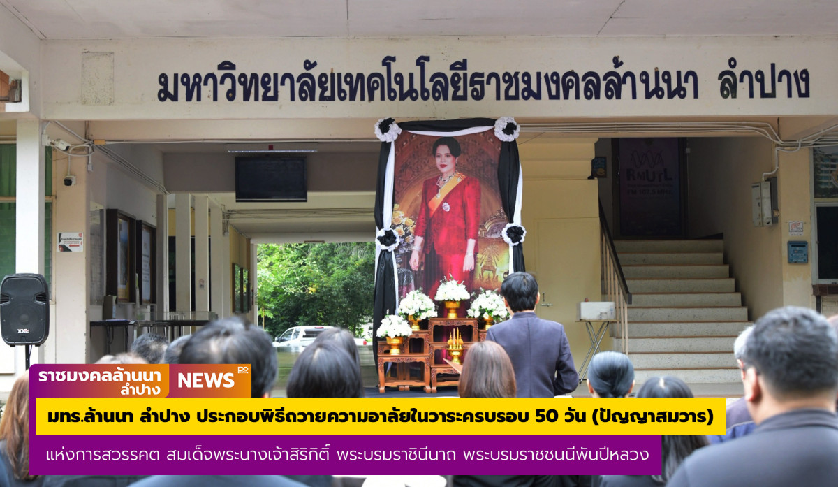 เช้าวันที่ 12 ธันวาคม 2568 ผู้ช่วยศาสตราจารย์ไพโรจน์ ไชยเมืองชื่น ผู้อำนวยการสำนักงานบริหาร มหาวิทยาลัยเทคโนโลยีราชมงคลล้านนา ลำปาง (มทร.ล้านนา ลำปาง) นำคณะผู้บริหาร คณาจารย์ บุคลากร และนักศึกษา มทร.ล้านนา ลำปาง ประกอบพิธีถวายความอาลัยในวาระครบรอบ 50 วัน (ปัญญาสมวาร) แห่งการสวรรคต สมเด็จพระนางเจ้าสิริกิติ์ พระบรมราชินีนาถ พระบรมราชชนนีพันปีหลวง ณ บริเวณอาคารอำนวยการ มทร.ล้านนา ลำปาง