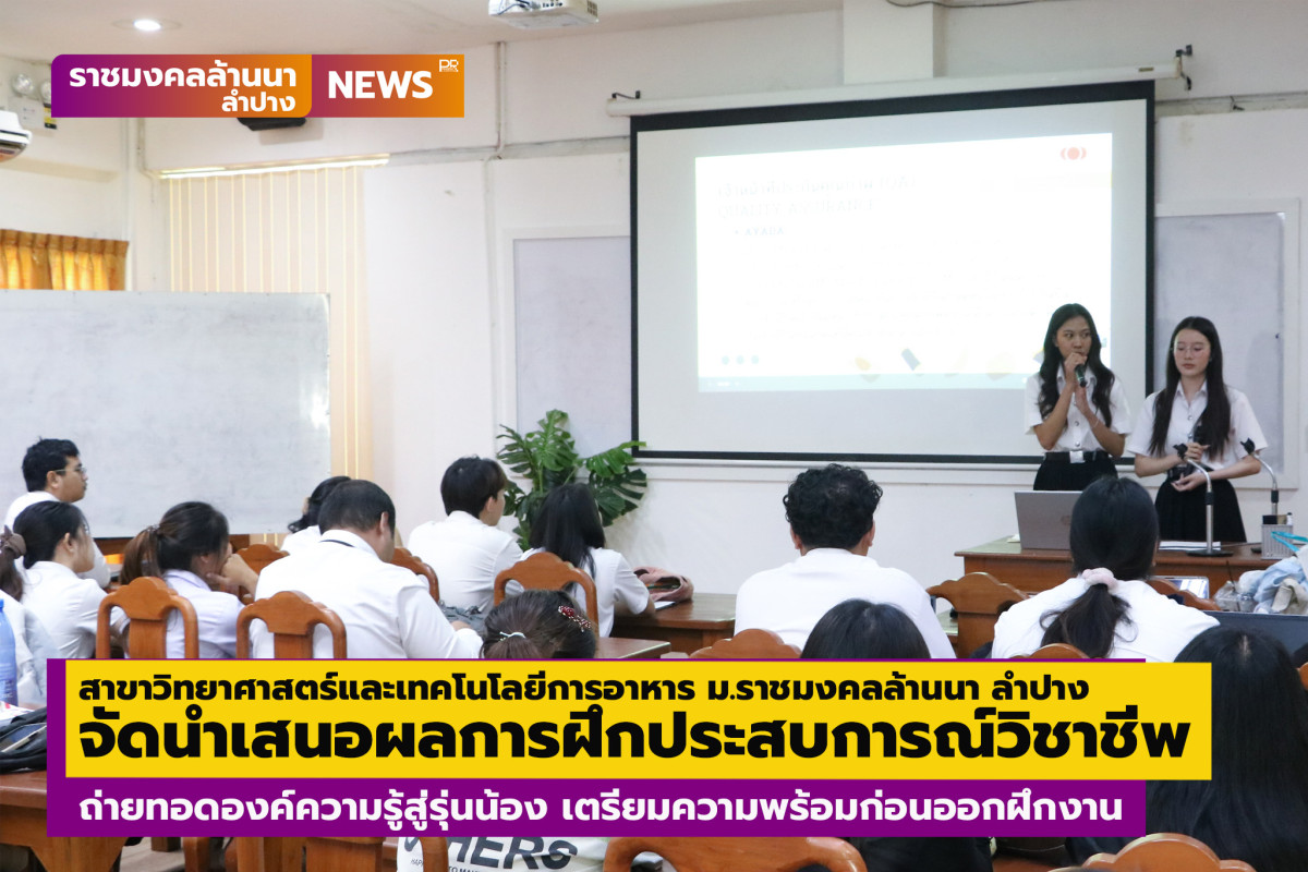 เมื่อวันที่ 20 มีนาคม 2569 สาขาวิทยาศาสตร์และเทคโนโลยีการอาหาร คณะวิทยาศาสตร์และเทคโนโลยีการเกษตร มหาวิทยาลัยเทคโนโลยีราชมงคลล้านนา ลำปาง จัดกิจกรรมนำเสนอผลการฝึกประสบการณ์วิชาชีพของนักศึกษาชั้นปีสุดท้าย ณ อาคาร Coffee Go Green เพื่อเปิดโอกาสให้นักศึกษาได้ถ่ายทอดองค์ความรู้และประสบการณ์การทำงานจริง พร้อมแลกเปลี่ยนเรียนรู้ร่วมกันภายในสาขา