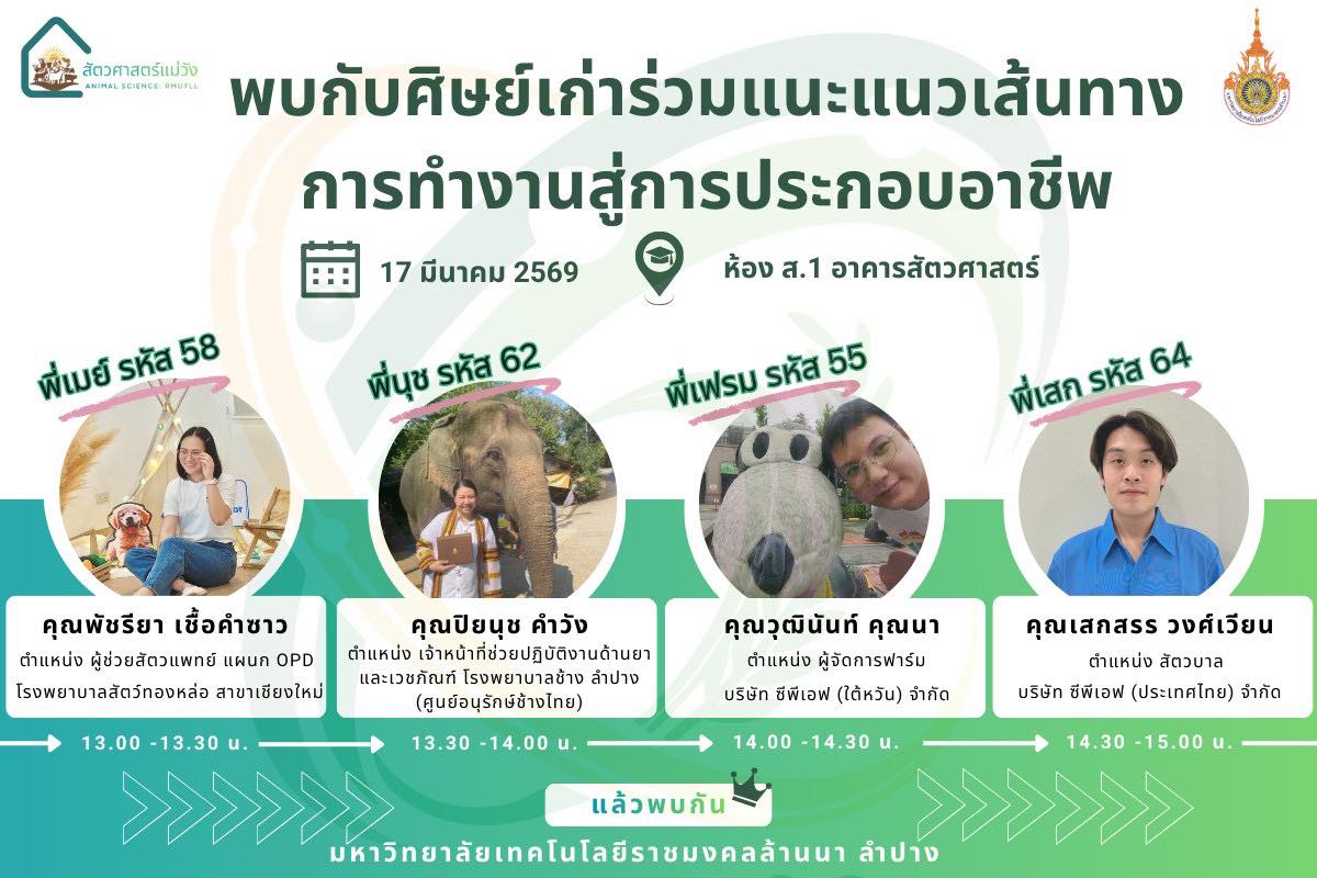 ทั้งนี้ ภายในกิจกรรมยังได้รับเกียรติจากศิษย์เก่าที่สำเร็จการศึกษา ประกอบด้วย นางสาวพัชรียา เชื้อคำซาว ผู้ช่วยสัตวแพทย์ แผนก OPD โรงพยาบาลสัตว์ทองหล่อ สาขาเชียงใหม่ นางสางปิยนุช คำวัง เจ้าหน้าที่ช่วยปฏิบัติงานด้านยาและเวชภัณฑ์ โรงพยาบาลช้างลำปาง (ศูนย์อนุรักษ์ช้างไทย) นายวุฒินันท์ คุณนา ผู้จัดการฟาร์ม บริษัท ซีพีเอฟ (ไต้หวัน) จำกัด และนายเสกสรร วงศ์เวียน สัตวบาล บริษัท ซีพีเอฟ (ประเทศไทย) จำกัด เข้าร่วมถ่ายทอดประสบการณ์การทำงานจริง พร้อมแนะแนวเส้นทางสู่อาชีพ เพื่อสร้างแรงบันดาลใจและเปิดมุมมองใหม่ให้กับนักศึกษา นับเป็นการเชื่อมโยงเครือข่ายระหว่างศิษย์เก่าและศิษย์ปัจจุบัน อีกทั้งยังสะท้อนถึงคุณภาพของบัณฑิตที่สามารถนำองค์ความรู้ไปประยุกต์ใช้ได้อย่างเป็นรูปธรรมในภาคอุตสาหกรรม